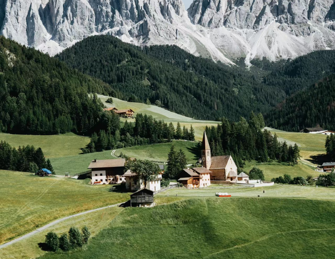 下午:前往富内斯山谷漫步,白云峰下的Santa Magdalena小镇被风景牧场包围的圣乔凡尼孤独教堂
